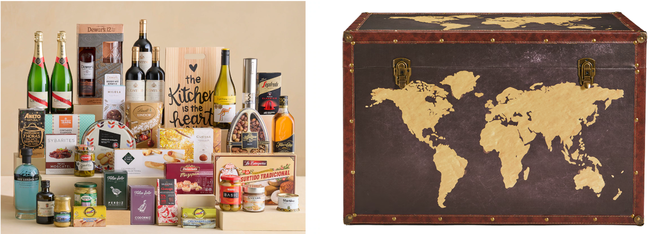 Una cesta navideña única presentada en un elegante Baúl Mapamundi, repleta de productos gourmet, jamón ibérico 100% bellota, vinos, champagne, licores, dulces tradicionales y delicatessen de primeras marcas.